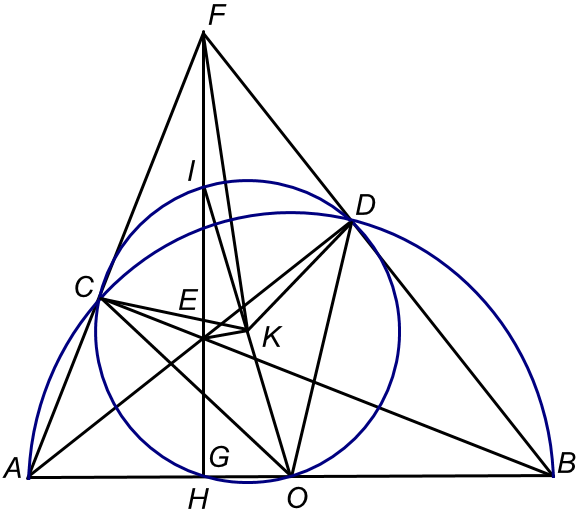 c) Gọi $K$ là tâm đường tròn ngoại tiếp tam giác $COD$. Chứng minh rằng $FK$ là phân giác của góc $\widehat{AFB}$.