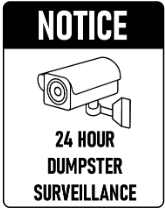 Biển báo: “NOTICE. 24 hour dumpster surveillance.”