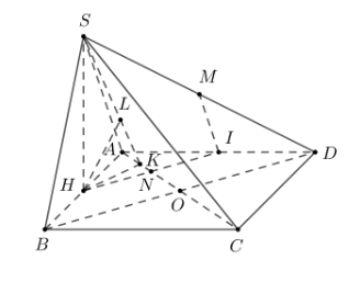 Khi đó $d\left( {M,\left( {SAC} \right)} \right) = d\left( {I,\left( {SAC} \right)} \right) = d\left( {H,\left( {SAC} \right)} \right)$