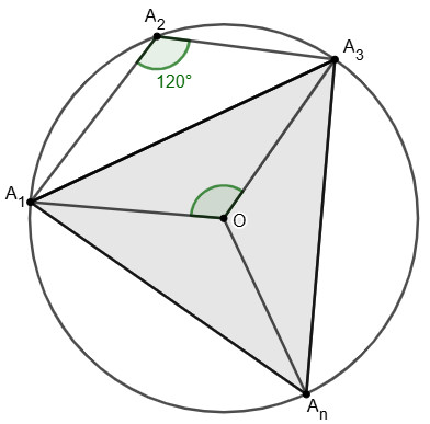 Một tam giác nội tiếp có một góc bằng $120^{{^\circ}}$ khi và chỉ khi hai đỉnh còn lại tạo thành một cung tròn có số đo $120^{{^\circ}}$ (tương ứng với 12 khoảng giữa các đỉnh trong đa giác 36 đỉnh).