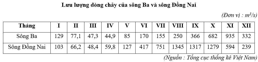 | d) Lưu lượng dòng chảy của sông Ba và sông Đồng Nai không đều giữa các tháng. |