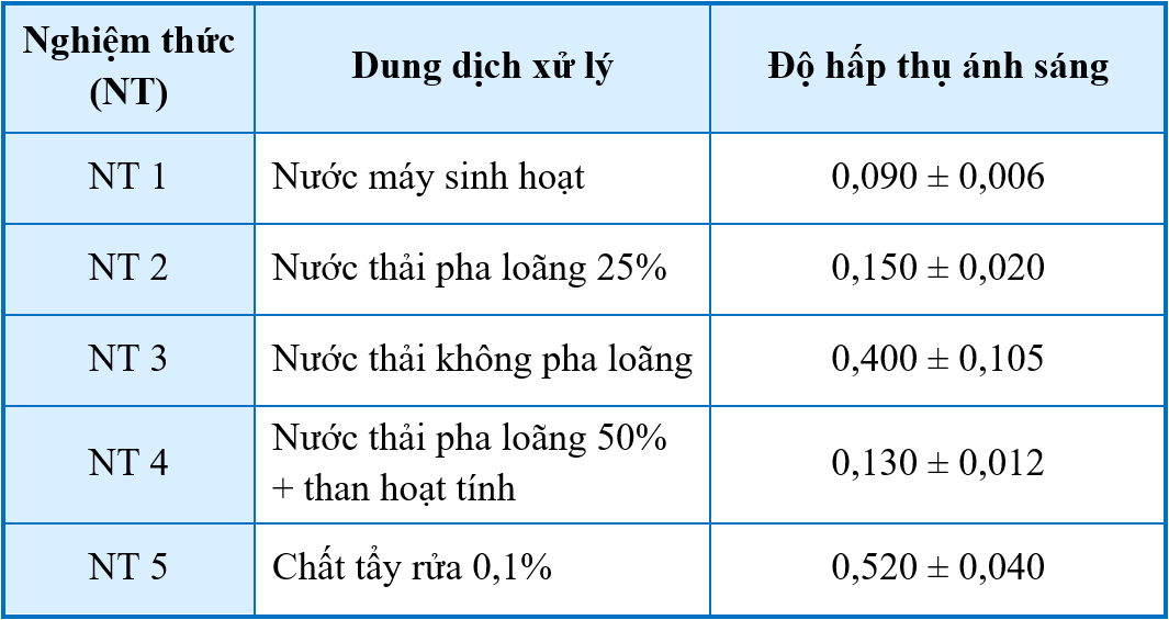 Để đánh giá ảnh hưởng của nước thải sinh hoạt đến tính thấm của màng tế bào sinh vật, sinh viên sử dụng 5 mẫu mô rễ củ cải đường giống nhau (có chứa sắc tố tím betacyanin) làm vật liệu thí nghiệm. Mỗi mẫu mô được rửa sạch và ngâm vào một ống nghiệm chứa 5 mL dung dịch tương ứng với một nghiệm thức. Nước thải sinh hoạt được pha loãng bằng nước máy sinh hoạt theo các tỷ lệ quy định trong bảng. Sau khi ủ trong 15 phút ở 25oC, độ hấp thụ của dung dịch được đo tại bước sóng 460 nm (A460). Giá trị độ hấp thụ ánh sáng phản ánh mức độ khuếch tán betacyanin qua màng tế bào, từ đó xác định sự thay đổi tính thấm của màng tế bào. Thí nghiệm được lặp lại 5 lần, số liệu thu được là giá trị trung bình của 5 lần đo.