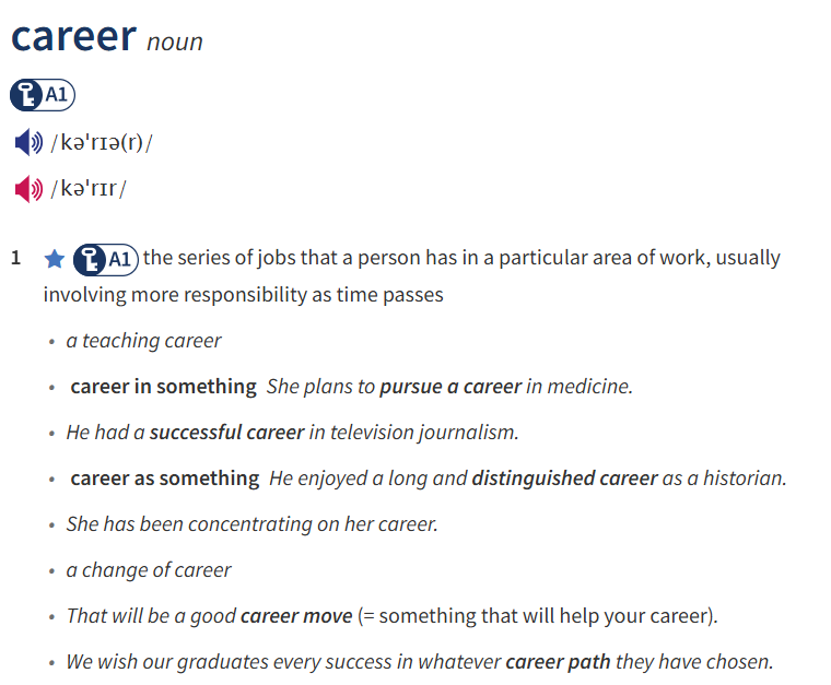 VI. Look at the entry of the word ‘career’ in a dictionary. Use what you can get from the entry to complete the