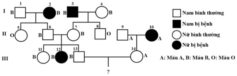 Cho sơ đồ phả hệ mô tả sự di truyền nhóm máu ABO và một bệnh M ở người do 2 locus thuộc 2 cặp nhiễm sắc thể khác nhau quy định. Biết rằng, bệnh M trong phả hệ là do một trong 2 allele của một gene, tương tác gene có allele kiểu trội lặn hoàn toàn quy định; gene quy định nhóm máu gồm 3 allele IA, IB, IO; trong đó allele IA quy định nhóm máu A, allele IB quy định nhóm máu B đều trội hoàn toàn so với allele IO quy định nhóm máu O; allele IA allele IB là hai gene allele tương tác kiểu đồng trội quy định nhóm máu AB. Giả sử quần thể người đang ở trạng thái cân bằng di truyền Hardy - Weinberg về tính trạng nhóm máu với 4% số người có nhóm máu O và 21% số người có nhóm máu B.