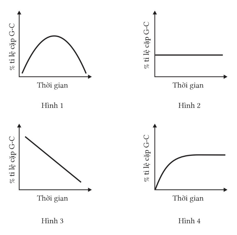 Một nhà khoa học tiến hành nghiên cứu ảnh hưởng của tác nhân đột biến 5-BU lên vi khuẩn E. coli bằng cách tác động lên hệ gene của vi khuẩn này trong một thời gian rồi dừng lại và tiến hành đo % tỉ lệ cặp G – C, hình nào mô tả đúng kết quả thí nghiệm này?