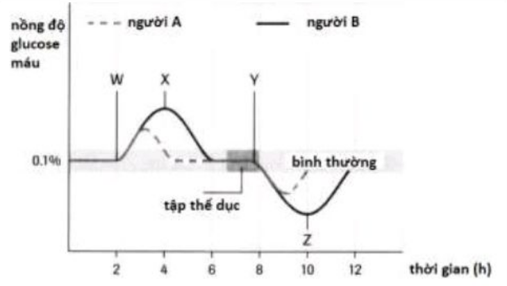 | a) Thời điểm W, cả A và B đều dùng bữa, lượng đường trong máu tăng đột biến ở cả hai. Thời điểm Y, cả A và B đều bắt đầu tập thể dục, lượng đường trong máu sẽ giảm. | ||
