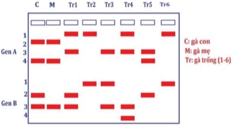 Bên đây là hình ảnh điện di trình tự hai gene (A và B, mỗi gene có 2 allele) của một con gà con