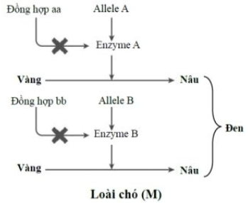 Tính trạng màu lông ở loài chó M được mô tả bằng sơ đồ hóa sinh bên. Biết rằng các gene