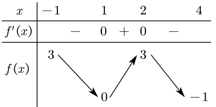 Cho hàm số $y = f(x)$ xác định trên khoảng $\left\lbrack {- 1;4} \right\rbrack$ và có bảng biến thiên như hình vẽ bên.