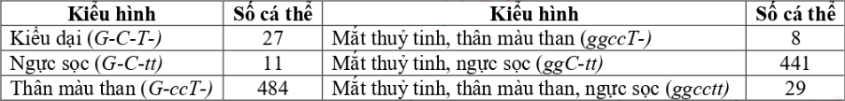 Ruồi giấm cái (P) có kiểu hình kiểu dại dị hợp tử về 3 gene (Gg, Cc, Tt) nằm trên nhiễm sắc thể thường được cho giao phối với con đực mang kiểu hình lặn tương ứng (mắt thủy tinh, thân màu than, ngực sọc). 1000 cá thể con thu được từ phép lai biểu hiện các lớp kiểu hình như sau: