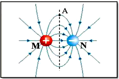 Hai điện tích điểm có cùng độ lớn, trái dấu nhau đặt gần nhau trong không khí tại hai điểm M và N (như hình vẽ bên). Tại điểm A cách đều hai điện tích điểm, vec tơ cường độ điện trường tổng hợp có hướng