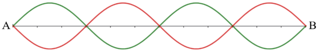 Một nhóm học sinh lớp 12 trường THPT Chuyên Phan Bội Châu tiến hành thí nghiệm tạo sóng dừng trên một sợi dây đàn hồi có hai đầu AB cố định (với $AB = 60\text{~cm}$) thu được hình ảnh sóng dừng trên dây như hình vẽ bên.