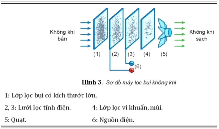 | b) Các hạt bụi mịn khi đi qua lưới (2) sẽ nhiễm điện dương và bị lưới (3) giữ lại. Còn màng lọc (4) được cấu tạo bởi than hoạt tính để loại bỏ mùi hôi, khói thuốc và khí độchại; màng (4) còn có bộ phận phát tia UV để khử khuẩn. | ||
