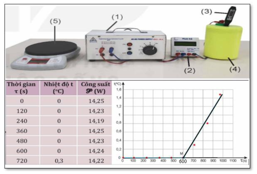 Một nhóm học sinh ở một trường THPT tại Nghệ An đã tiến hành thí nghiệm đo nhiệt nóng chảy riêng của nước đá. Bố trí thí nghiệm, số liệu đo được và vẽ được đồ thị như hình dưới đây.