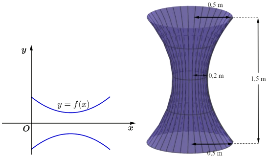 Xét hệ trục tọa độ Oxy với gốc O trùng với tâm đường tròn đáy của chậu nước, tia Ox chứa trục của chậu nước (đơn vị trên mỗi trục là mét). Mặt cắt qua trục của chậu nước cho ta hai nhánh parabol như hình vẽ, gọi $y = f(x)$ là parabol nằm trên trục hoành.