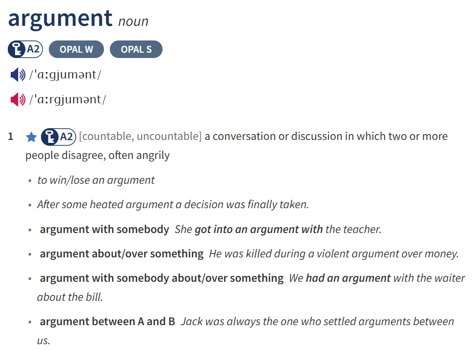 VI. Look at the entry of the word 'argument' in a dictionary. Use what you can get from the entry to complete the