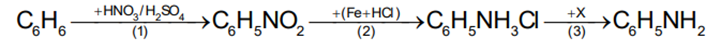 Trong phòng thí nghiệm, aniline có thể được điều chế từ benzene theo sơ đồ gồm ba giai đoạn được đánh số (1), (2) và (3) như sau: