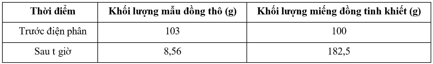 Một nhóm học sinh nghiên cứu quá trình tinh chế đồng từ một mẫu đồng thô (chứa đồng có hàm lượng là x%) bằng phương pháp điện phân và đưa ra giả thuyết “khối lượng mẫu đồng thô giảm bằng khối lượng cathode tăng”. Để kiểm chứng giả thuyết, nhóm học sinh thực hiện thí nghiệm sau: