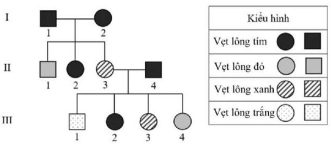 Biết rằng, enzyme 1 và enzyme 2 do 2 allele trội của 2 locus gene nằm trên 2 NST thường quy định. Allele lặn không tạo được enzyme có chức năng. Một nhà lai tạo thực hiện các phép lai. Kết quả được ghi nhận và thể hiện ở hình bên. Biết không có đột biến phát sinh. Theo lí thuyết, xác suất để cặp vẹt bố mẹ II.3 và II.4 sinh thêm được 1 vẹt con có lông tím là bao nhiêu %?