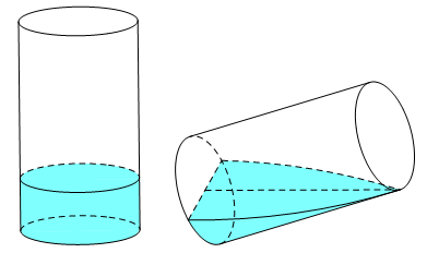 Có một cốc nước thủy tinh hình trụ, bán kính trong lòng đáy cốc là $6\,\text{cm}$, chiều cao lòng cốc là $10\,\text{cm}$ đang đựng một lượng nước. Tính thể tích lượng nước trong cốc (đơn vị $cm^{3}$) , biết khi nghiêng cốc nước vừa lúc khi nước chạm miệng cốc thì đáy mực nước trùng với đường kính đáy (Kết quả làm tròn đến hàng đơn vị).