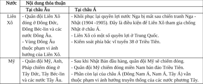Cho bảng dữ kiện về thỏa thuận của Liên Xô, Mỹ, Anh tại hội nghị I-an-ta (2-1945) trong việc