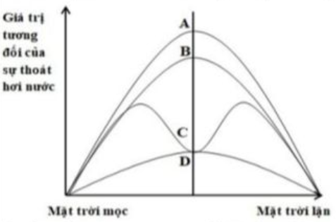 Hình sau biểu diễn quá trình thoát hơi nước của cây sống trong điều kiện khô hạn. Trong các đường cong A, B, C, D, đường cong nào mô tả sự thoát hơi nước qua lớp cutin (cuticle)?