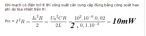 Một mạch dao động gồm tụ điện có điện dung C = 1µF mắc nối tiếp với cuộn cảm có độ tự cảm L = 0,1mH và điện trở r = 0,02Ω thành mạch kín. Để duy trì dao động của mạch với điện áp cực đại trên tụ là 10V thì phải cung cấp cho mạch một công suất bao nhiêu?
