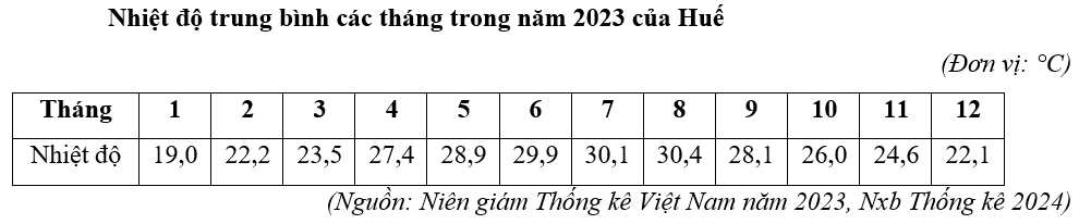 Căn cứ vào bảng số liệu, hãy cho biết biên độ nhiệt độ trung bình năm 2023 của Huế là bao nhiêu °C (làm tròn kết quả đến một chữ số thập phân).