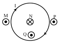 Hình bên diễn tả chiều cảm ứng từ tạo bởi dòng điện không đổi I chạy trong một vòng dây dẫn hình tròn tại các điểm nằm trong mặt phẳng dây dẫn. Tại điểm nào có kí hiệu không đúng với chiều của cảm ứng từ tại đó?