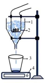 Một nhóm học sinh thảo luận phương án thí nghiệm làm giảm ảnh hưởng của sự trao đổi nhiệt với môi trường khi đo nhiệt nóng chảy riêng của nước đá. Họ dùng các dụng cụ: Phễu chứa nước đá (1), dây điện trở (2), cốc (3), cân điện tử (4) như hình bên.