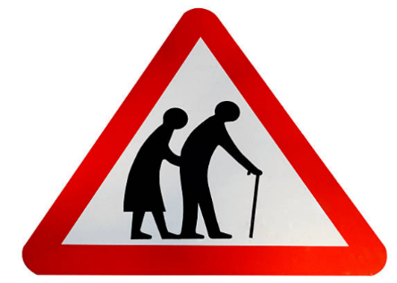 Biển báo hình tam giác viền đỏ, bên trong có hình hai người già cầm gậy đang đi bộ, thường dùng để cảnh báo người lái xe chú ý vì có người già băng qua đường.