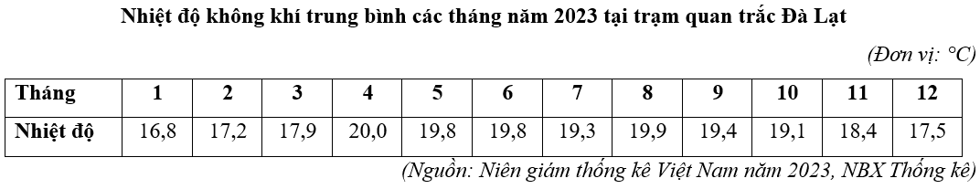 Căn cứ vào bảng số liệu, hãy cho biết biên độ nhiệt độ trung bình năm 2023 tại trạm quan trắc Đà Lạt là bao nhiêu °C? (làm tròn kết quả đến một chữ số thập phân).