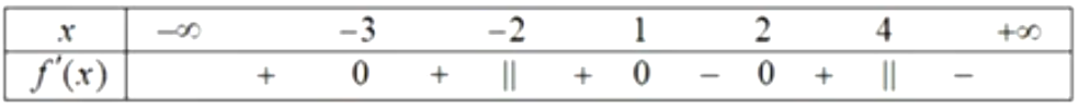 Cho hàm số \(f(x)\) liên tục trên \(\mathbb{R} \backslash\{4\}\) và có bảng xét dấu của \(f^{\prime}(x)\) như sau: