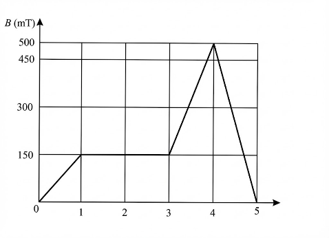 Một nhóm học sinh chế tạo máy phát điện gió mini dùng cho chiếu sáng khẩn cấp, họ sử dụng một khung kim loại hình tròn gồm 40 vòng dây có đường kính 5 cm đặt cố định trong vùng từ trường đều tạo bởi một nam châm điện. Các đường sức từ vuông góc với mặt phẳng khung dây. Hai đầu của khung kim loại được nối với một bóng đèn LED công suất nhỏ, tạo thành một mạch điện kín. Khi cường độ dòng điện qua nam châm điện được điều chỉnh, độ lớn cảm ứng từ trong vùng khung dây thay đổi theo thời gian như đồ thị hình bên, làm xuất hiện dòng điện cảm ứng trong mạch khiến bóng đèn có thể sáng lên trong một khoảng thời gian ngắn. Biết điện trở của khung kim loại và bóng đèn lần lượt là R1 = 2Ω và R2 = 1Ω.