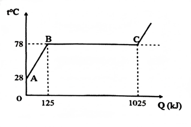 Một thí nghiệm khảo sát sự thay đổi nhiệt độ của một lượng rượu Ethylic theo nhiệt lượng cung cấp thu được đồ thị có dạng như hình bên. Biết hiệt dung riêng của rượu Ethylic là c = 2500 J/(kgK). Nhiệt hóa hơi riêng của rượu Ethylic xác định được trong thí nghiệm trên là bao nhiêu kJ/kg? (Làm tròn kết quả đến chữ số hàng đơn vị).