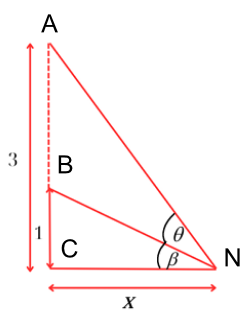Gọi $\theta$là góc nhìn của người quan sát, $\beta$ là góc nghiêng của tia sáng truyền từ mép dưới bức ảnh tới mắt so với mặt đất, $\alpha = \theta + \beta$là góc nghiêng của tia sáng truyền từ mép trên bức ảnh tới so với mặt đất. Tính $\cot\theta$ nhỏ nhất