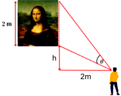 Giả sử người quan sát không thể thay đổi khoảng cách đứng cách bức tranh 2m, nhưng có thể điều chỉnh độ cao treo tranh. Để góc nhìn $\theta$ lớn nhất khi mép dưới của tranh cách tầm mắt một khoảng $h$. Khi đó góc $\theta$ bằng bao nhiêu?(Biết chiều cao tranh vẫn là $2\text{m}$).