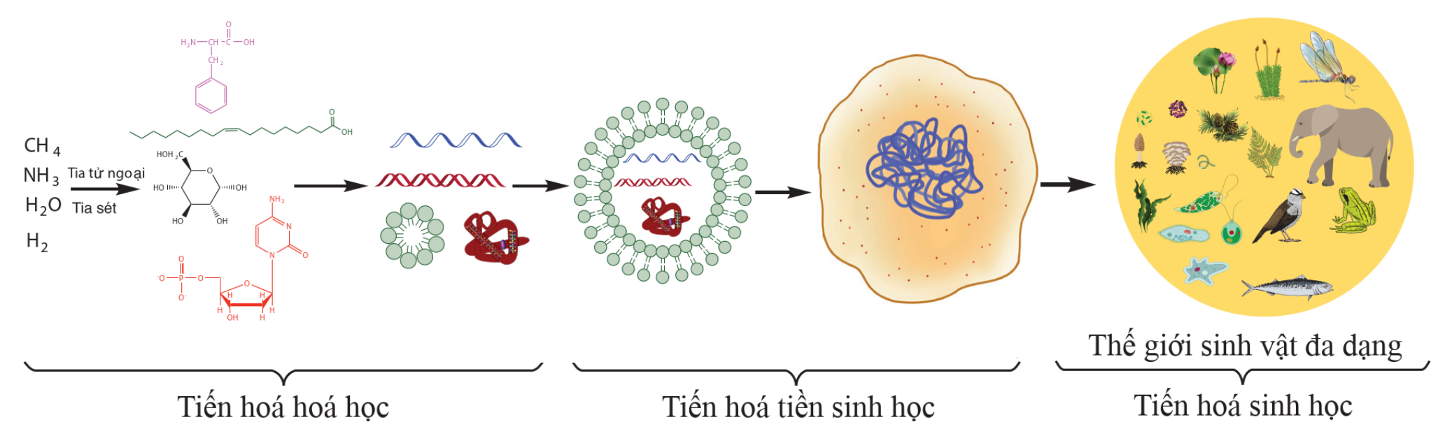 - Quan sát sơ đồ: Giai đoạn Tiến hóa hóa học là giai đoạn đầu tiên, đi từ các chất khí sơ khai (CH4, NH3, H2O, H2) dưới tác động của tia tử ngoại, tia sét tạo ra các đơn phân hữu cơ và đại phân tử.