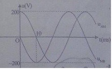 Đoạn mạch AB gồm đoạn AM (chứa tụ điện có điện dung C = 1/5π mF nối tiếp điện trở R và đoạn mạch MB (chứa cuộn dây có điện trở r). Đặt vào hai đầu AB một điện áp xoay chiều ổn định. Đồ thị theo thời gian của hai đoạn mạch AM và MB là uAM và uMB như hình vẽ. Lúc t = 0, dòng điện đang có giá trị i = +I0/√2 và đang giảm. Công suất tiêu thụ của mạch là