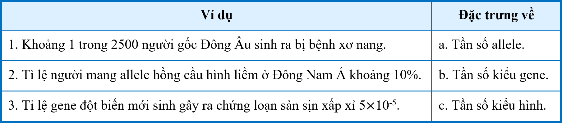 Hãy sắp xếp mỗi ví dụ sau đây tương ứng với một đặc trưng di truyền quần thể.