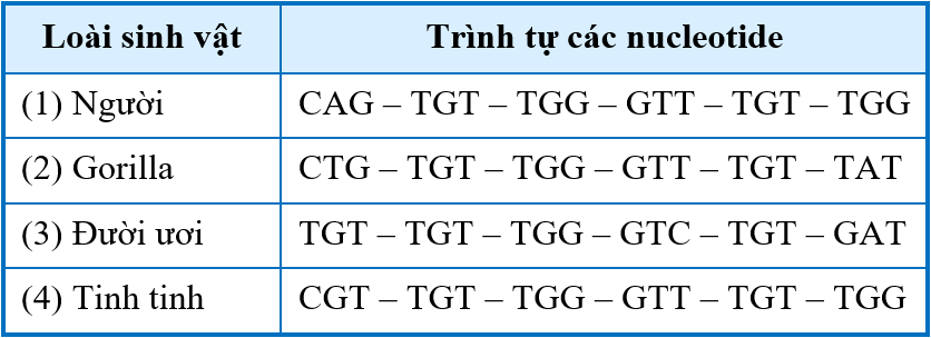 Để xác định quan hệ họ hàng giữa loài người và một số loài linh trưởng, các nhà khoa học đã phân tích một đoạn trình tự nucleotide trên mạch khuôn của một gene mã hóa cấu trúc nhóm enzyme dehydrogenase như trong bảng sau: