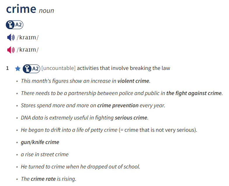 VI. Look at the entry of the word ‘crime’ in a dictionary. Use what you can get from the entry to complete the sentences with two or three words. (0.5pt)