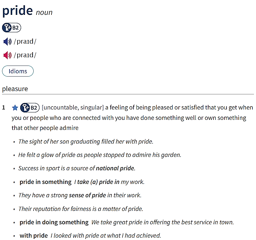 VI. Look at the entry of the word 'pride' in a dictionary. Use what you can get from the entry to complete the sentences with two or three words. (0.5pt)