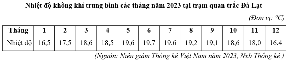 Căn cứ vào bảng số liệu trên, hãy cho biết nhiệt độ không khí trung bình của năm 2023 tại trạm quan trắc Đà Lạt là bao nhiêu °C (làm tròn kết quả đến một chữ số thập phân).