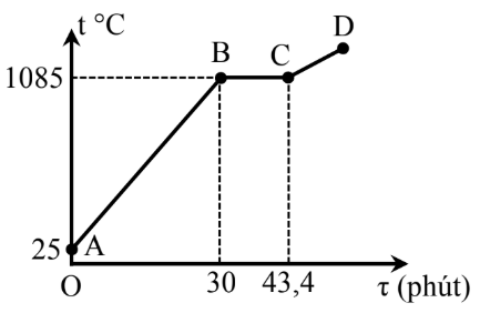 Trong phòng thí nghiệm, dùng lò nấu chảy kim loại để nấu một mẫu đồng. Hình bên là đồ thị biểu diễn sự phụ thuộc nhiệt độ của mẫu đồng theo thời gian. Lò cung cấp nhiệt với tốc độ không đổi là 121 kJ/phút, nhiệt nóng chảy riêng của đồng là $1,8.10^{5}J/kg$. Khối lượng của mẫu này là bao nhiêu kilôgam (làm tròn đến hàng phần trăm)?