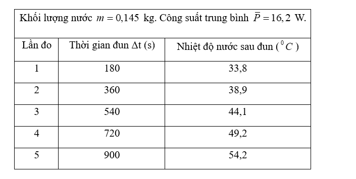 Xác định nhiệt dung riêng ($c$): Sử dụng công thức $c = \dfrac{\overline{P} \cdot \Delta t}{m \cdot \Delta T}$ cho các khoảng đo.
