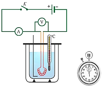 Hình vẽ bên là sơ đồ bố trí thí nghiệm đo nhiệt dung riêng của nước. Một học sinh làm thí nghiệm với 150 g nước, nhiệt độ ban đầu là 320C. Số chỉ vôn kế và ampe kế lần lượt là 3,2V và 2,5A. Sau khoảng thời gian 2 phút 37 giây thì nhiệt độ của nước là 340C. Bỏ qua nhiệt lượng mà bình nhiệt lượng kế và đũa khuấy thu vào; bỏ qua nhiệt lượng dây nung tỏa ra môi trường không khí.