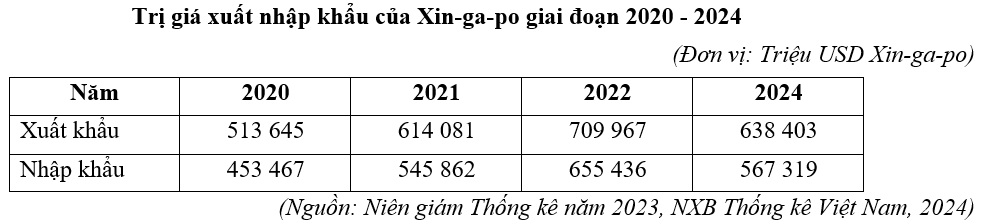 | b) Năm 2024 tổng trị giá xuất nhập khẩu của Xin-ga-po cao gấp hơn 1,2 lần năm 2020 và cán cân thương mại đạt trị giá lớn nhất. | ||