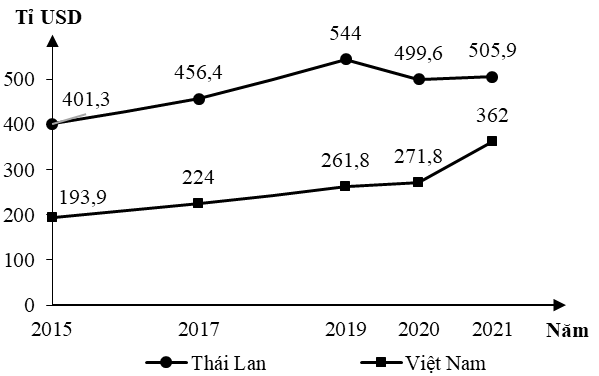 Biểu đồ dưới đây thể hiện nội dung nào về tổng sản phẩm trong nước của Thái Lan và Việt Nam, giai đoạn 2015 – 2021: