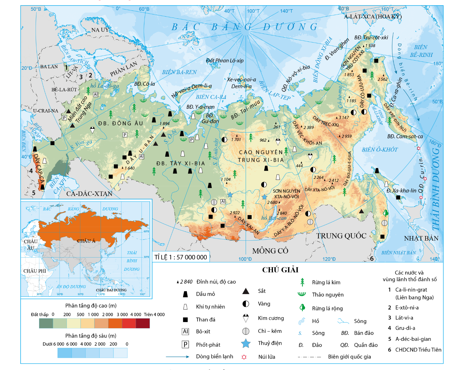 Cho bản đồ sau và trả lời 3 câu hỏi bên dưới:Bản đồ tự nhiên Liên bang